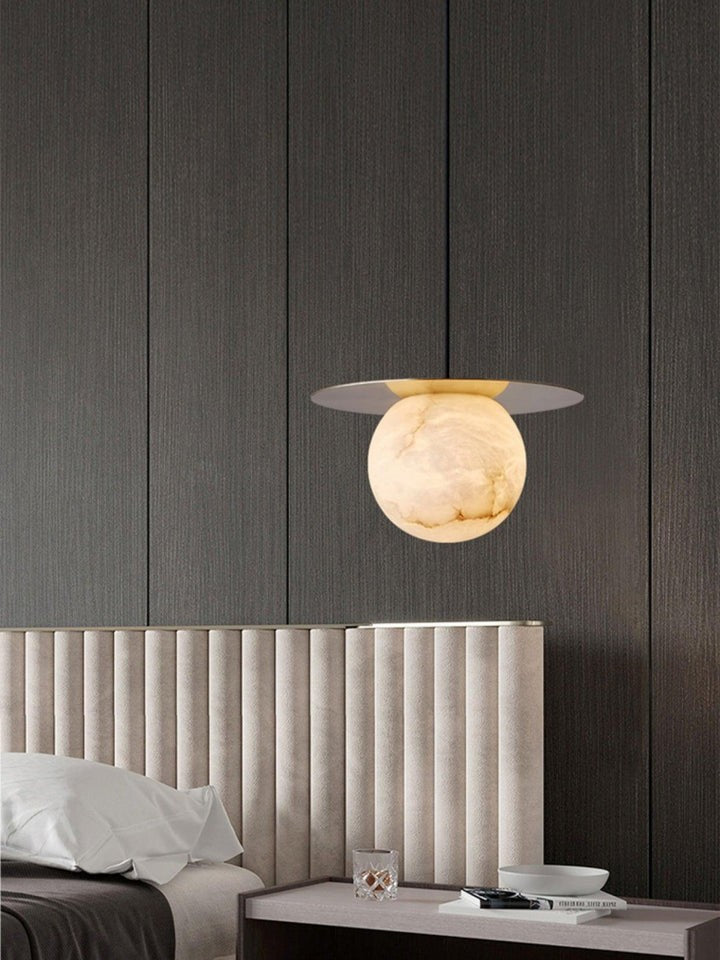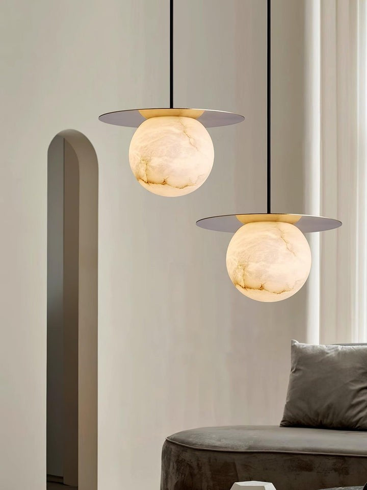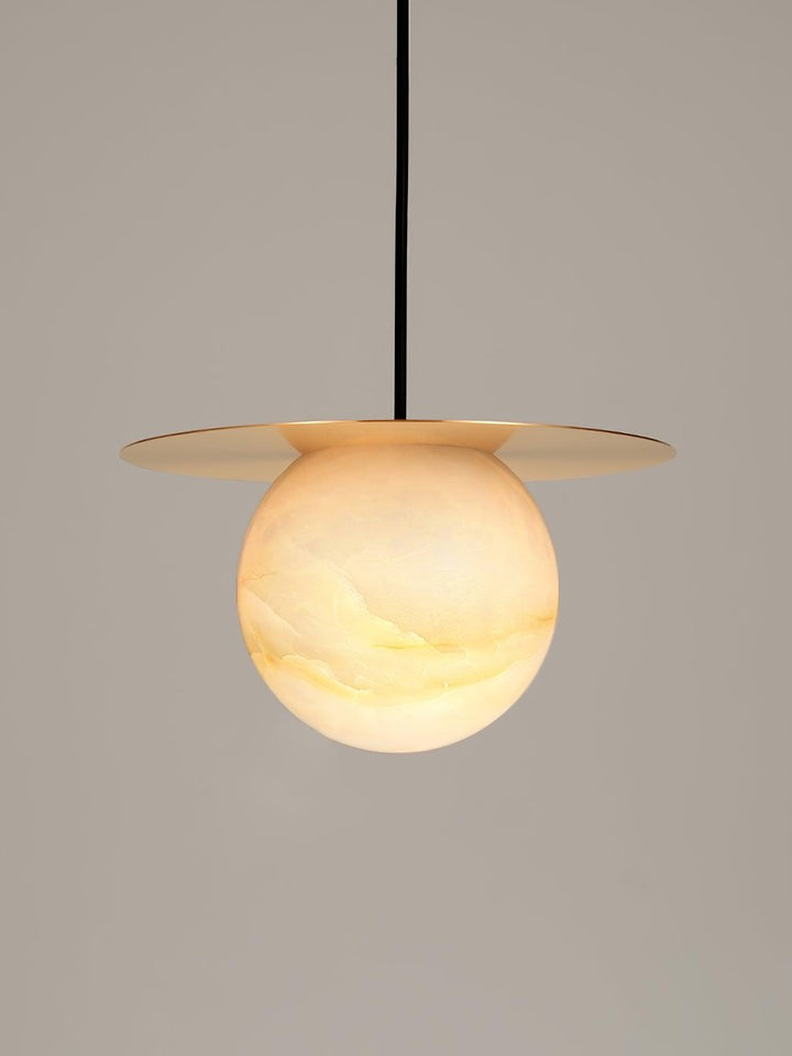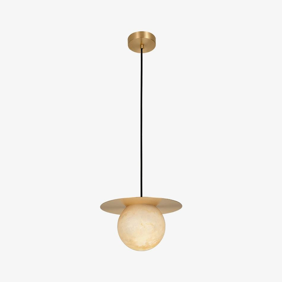 Elevate your space with this refined ceiling pendant, featuring a milky alabaster globe perched on a polished brass disc to cast a warm, elegant glow.