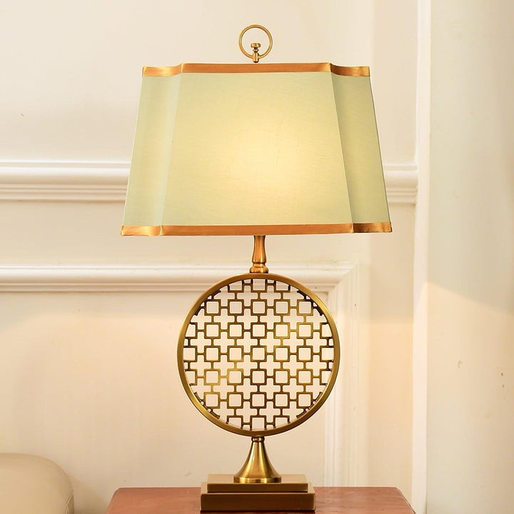 Bring a touch of refined elegance to any room with this brass table lamp, featuring a blue linen shade and gleaming polished gold finish.
