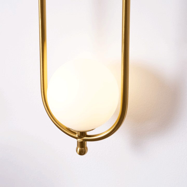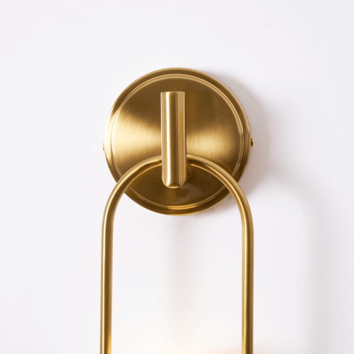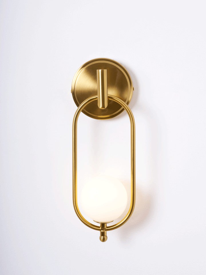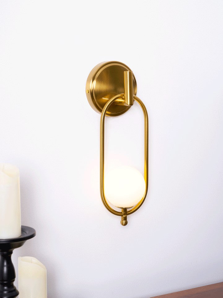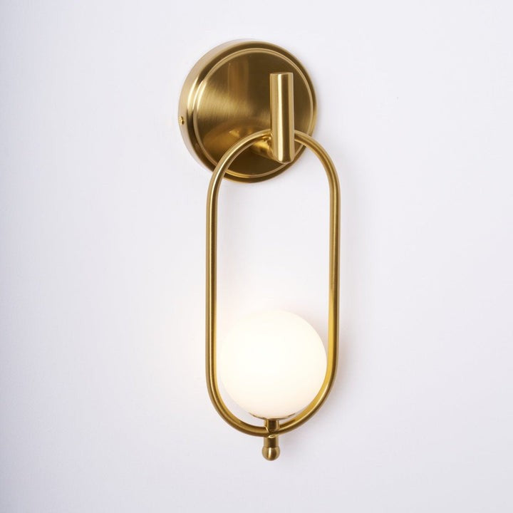 Elevate your interior with a modern wall sconce featuring a brushed brass oval frame and a frosted glass globe for soft, ambient lighting.