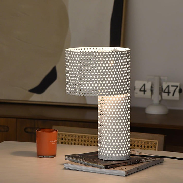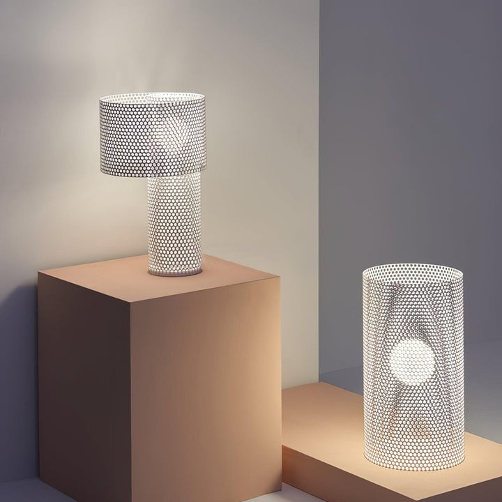Experience an atmospheric glow with this perforated gradient metal table lamp, designed to cast ethereal light through its delicate pattern. Its slim, white lacquered form complements modern interiors and brings a touch of industrial minimalism to any space.