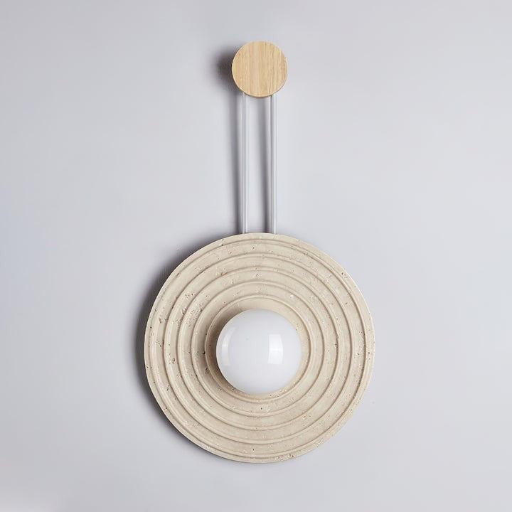 Create a serene focal point with this wall sconce inspired by natural growth rings and pendulum clocks, crafted from yellow travertine, wood, and glass for a warm, ambient glow.