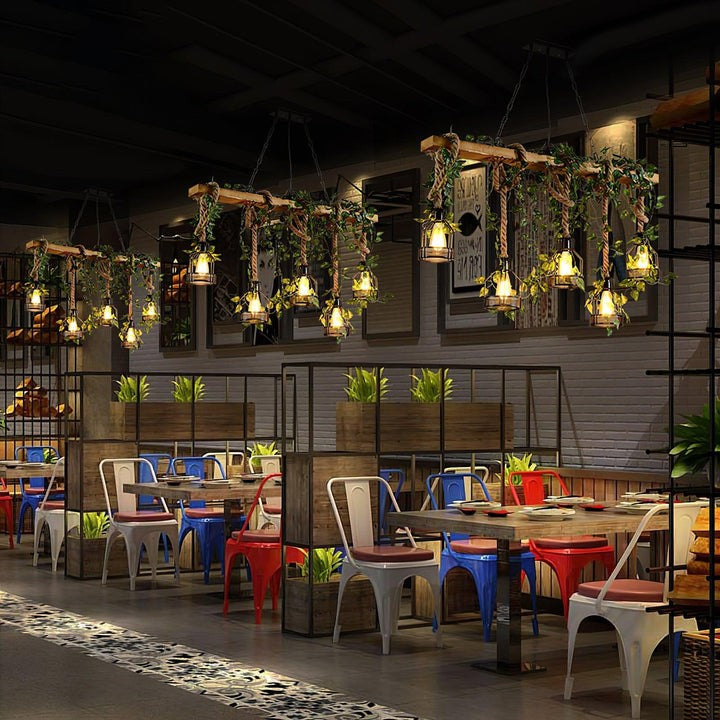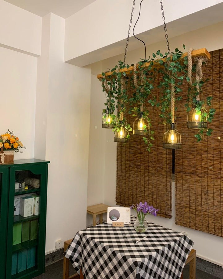 Elevate your space with this handcrafted rustic chandelier, featuring reclaimed wood, hemp rope detailing, and a warm, inviting glow perfect for dining and living areas.
