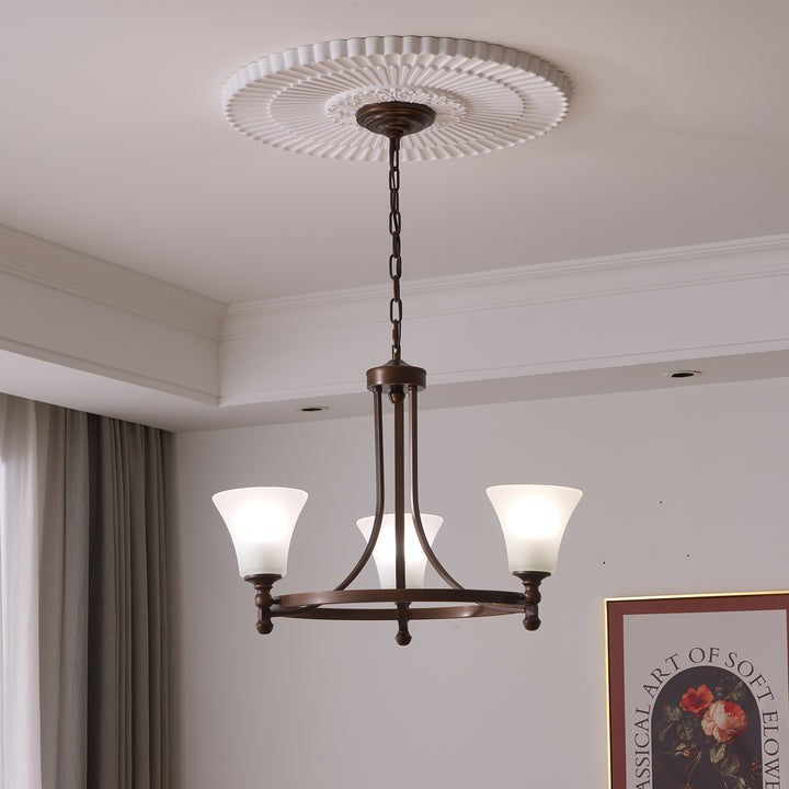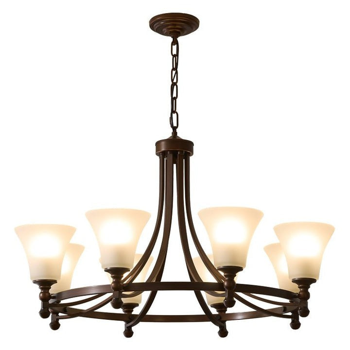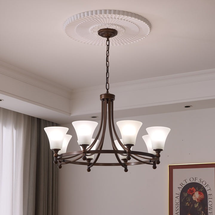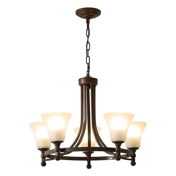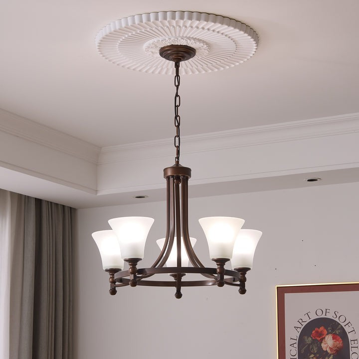 Elevate your living or dining space with this modern chandelier featuring frosted glass shades and a rich bronze frame for a warm, ambient glow.