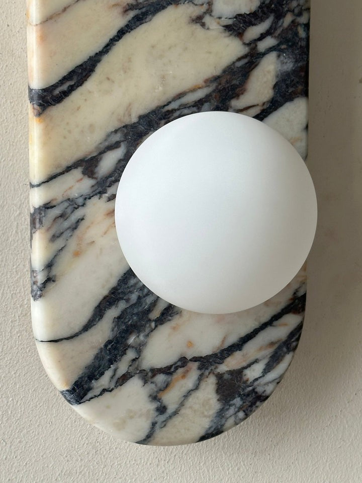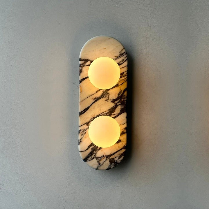 Elevate your interior with this sleek wall sconce featuring a polished marble base and dual white glass shades, casting a warm, ambient glow.