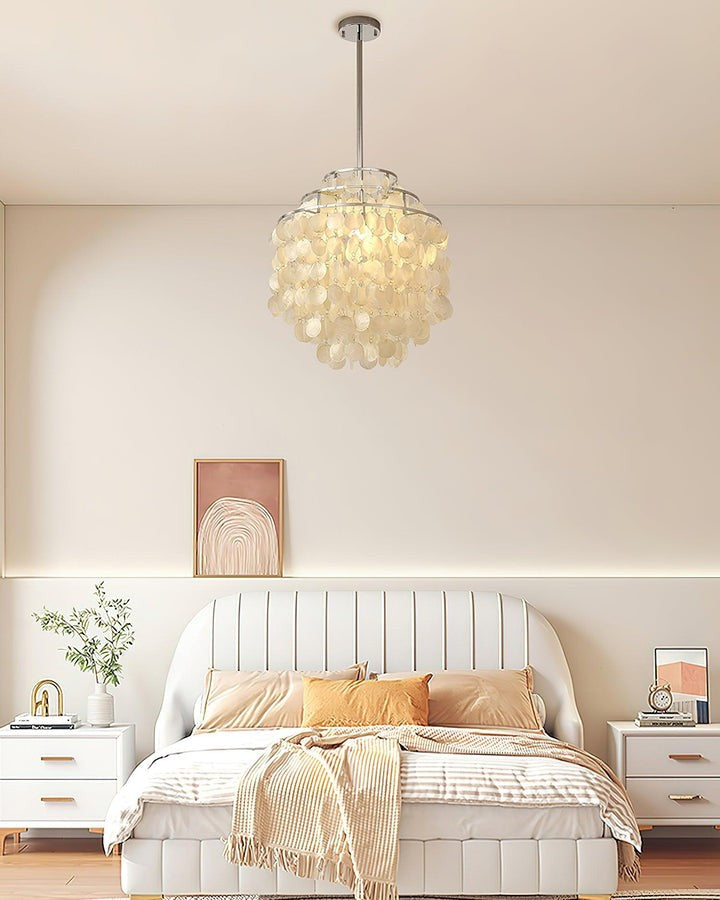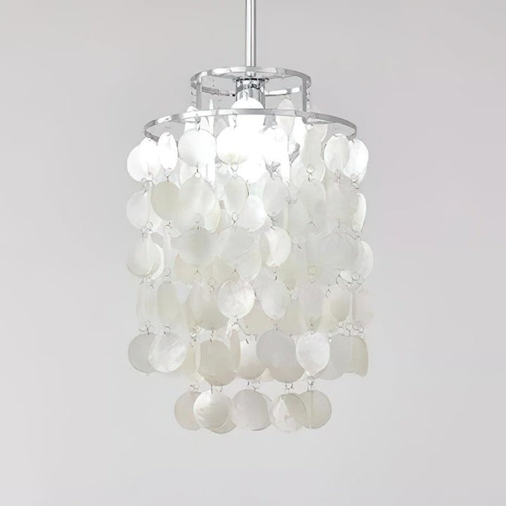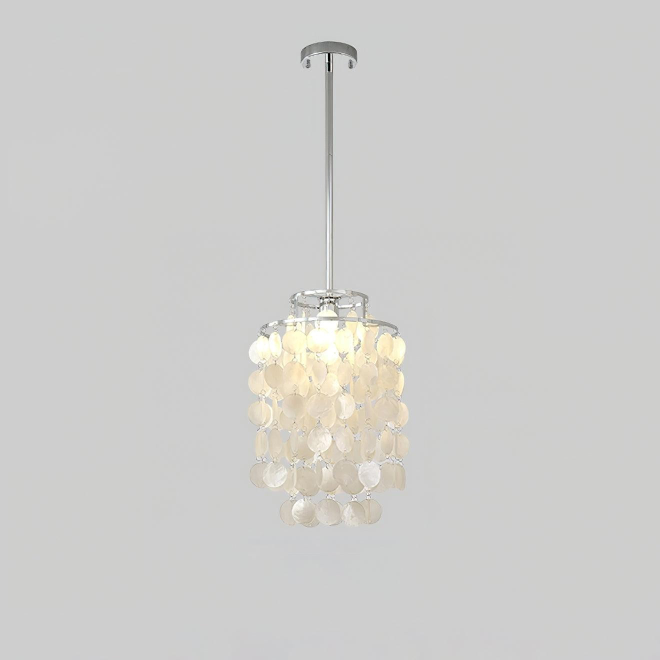 Elevate your interior with a stunning multi-tiered chandelier crafted from natural shell discs and a sleek metal frame. Perfect for adding a touch of modern elegance to dining rooms, living areas, or foyers.