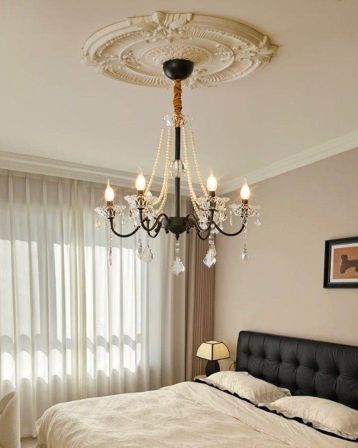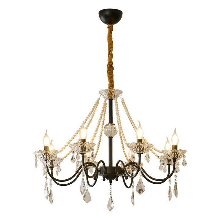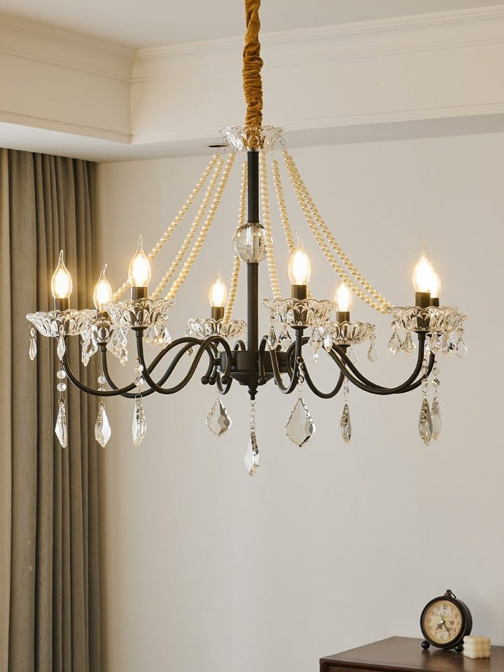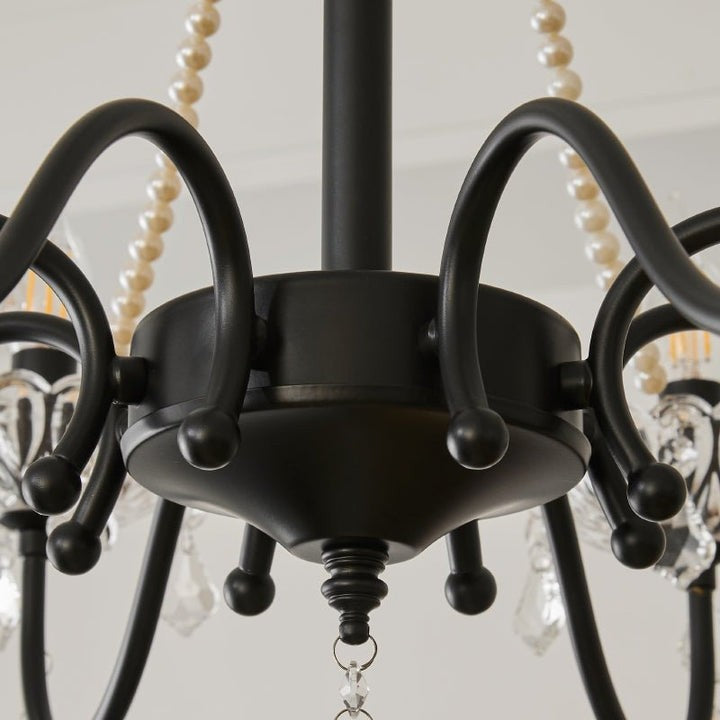 Illuminate your space with this opulent ceiling chandelier featuring a black iron frame adorned with clear crystals and lustrous pearls. Its elegant silhouette and radiant finish deliver a luxurious ambiance to any living room, dining area, or foyer.
