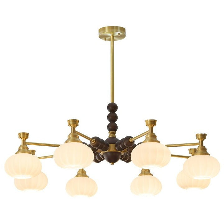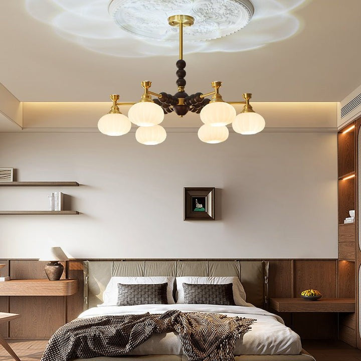 Elevate your interiors with a modern chandelier that blends iron, warm wood accents, and luminous glass orbs for an organic ambiance.