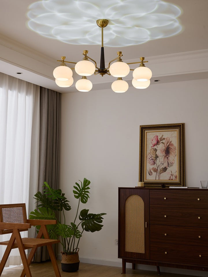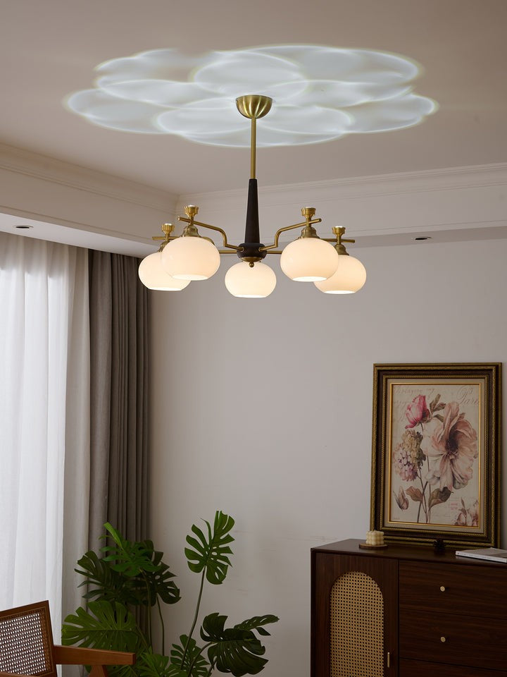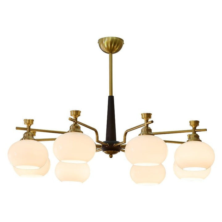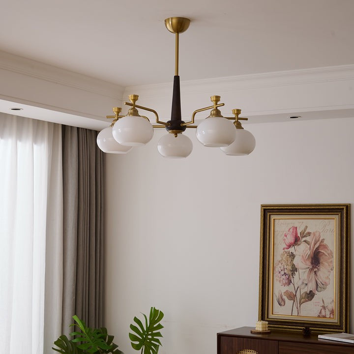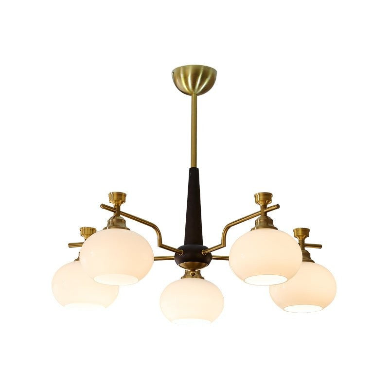 - Finishes: Gold metal frame, Walnut wood accents, White glass shades