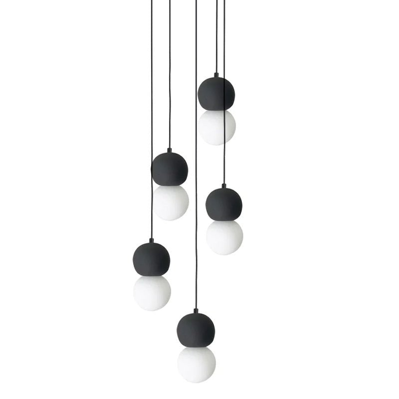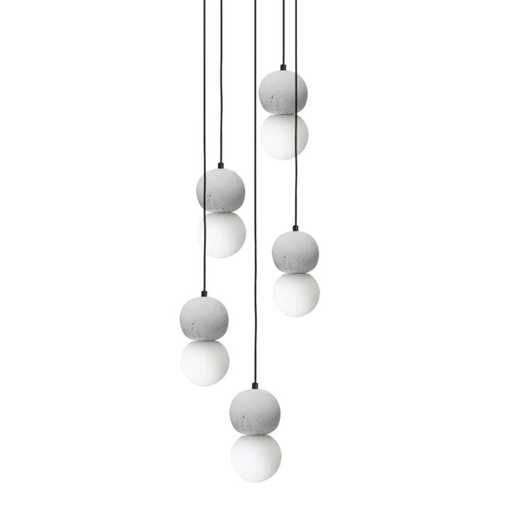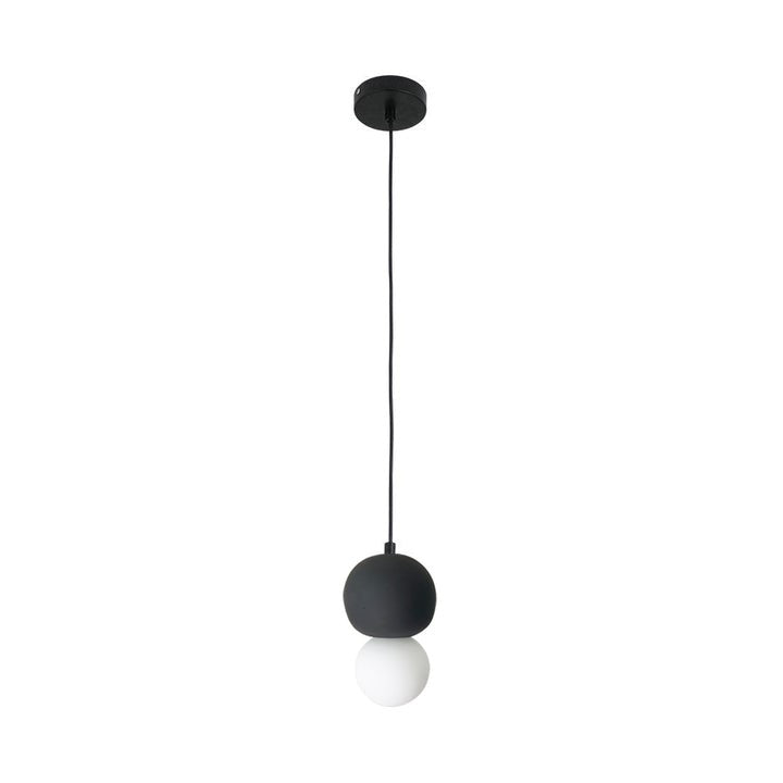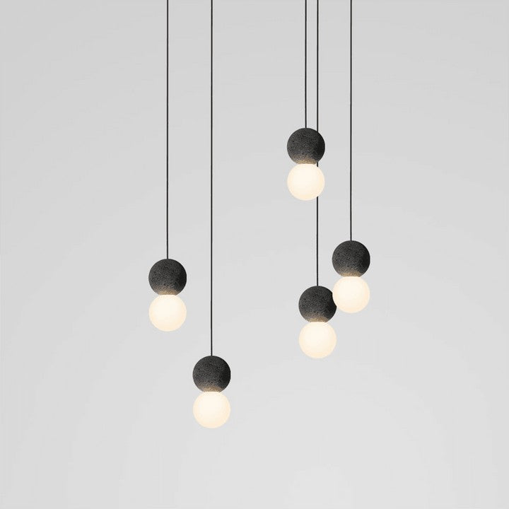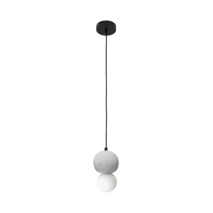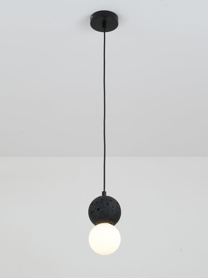 Featuring a stark volcanic rock body paired with a luminous opal glass sphere, this pendant light harmonizes raw texture and soft illumination. Its geometric simplicity and balanced proportions create a sculptural focal point that highlights the interplay of light and shadow.