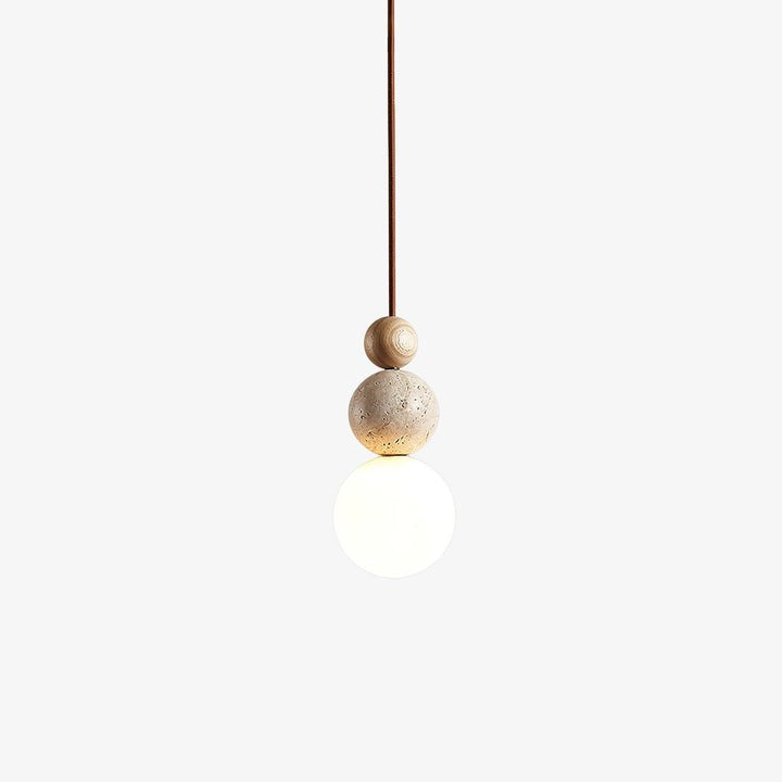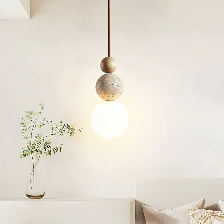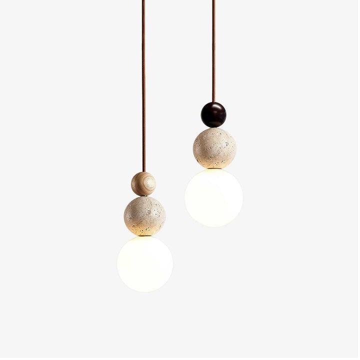 This Stacked Globe Duo Pendant Light blends warm wood accents with natural yellow travertine for a serene, balanced ambiance in dining areas, bedrooms, or cozy corners.