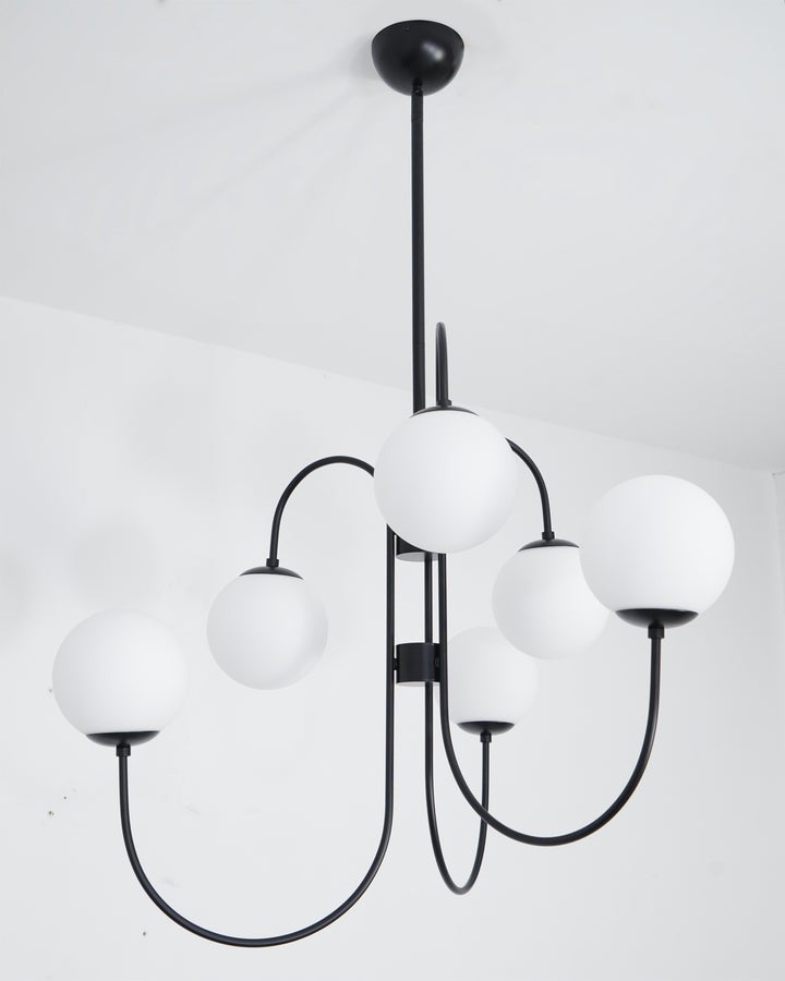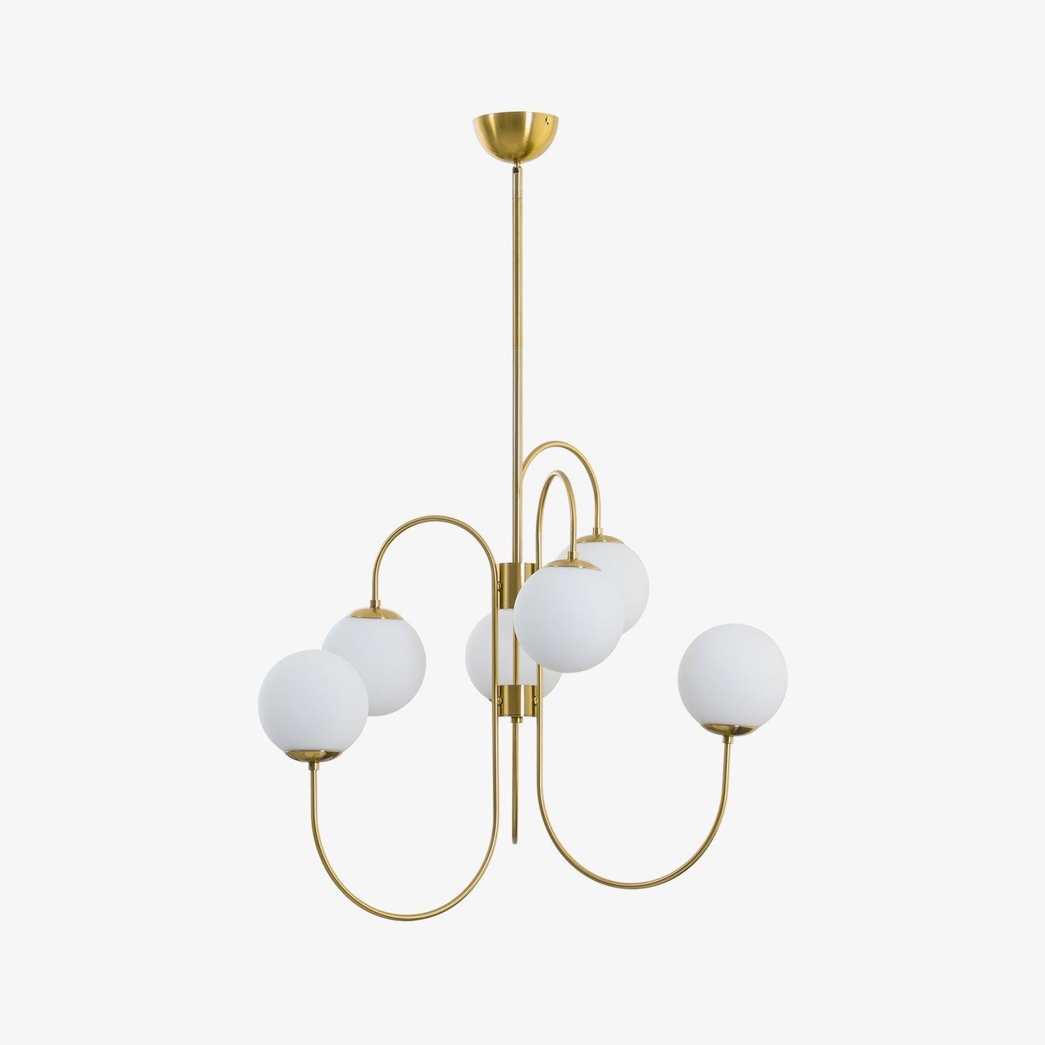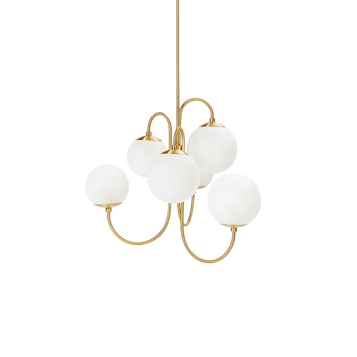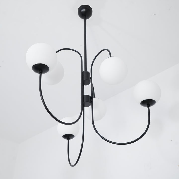 Elevate any space with this sculptural chandelier, featuring gracefully curved metal arms and soft-glowing glass globes for an inviting ambiance.
