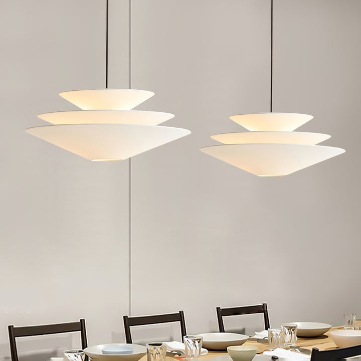 Illuminate your space with a modern tiered pendant featuring three inverted cone shades that cast a soft, balanced glow. Its sleek matte finish complements any contemporary interior.