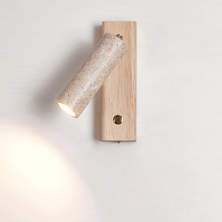 Elevate your interior with this elegant wall-mounted sconce, featuring a travertine cylinder and walnut wood base that evokes a modern torch silhouette.